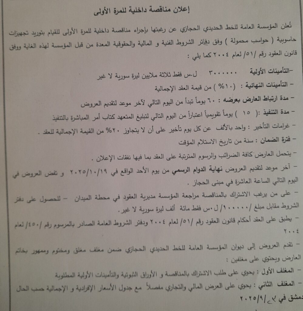 مناقصة داخلية للمرة الأولى لتوريد تجهيزات حاسوبية (حواسب محمولة) تصفّح المقالات مزاد علني لاستثمار قطعة أرض مقام عليها مغسل ومشحم مقابل كازية نهر عيشة اترك تعليقاً إلغاء الردلن يتم نشر عنوان بريدك الإلكتروني. الحقول الإلزامية مشار إليها بـ *التعليق * الاسم * البريد الإلكتروني * الموقع الإلكتروني احفظ اسمي، بريدي الإلكتروني، والموقع الإلكتروني في هذا المتصفح لاستخدامها المرة المقبلة في تعليقي.