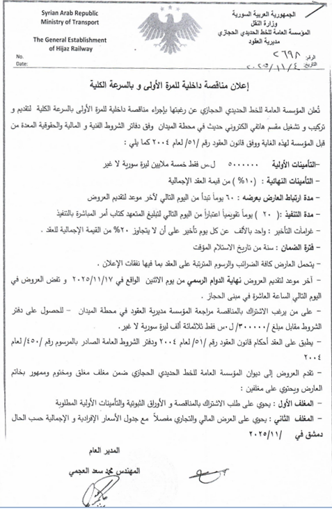 مناقصة لتقديم وتركيب وتشغيل مقسم هاتفي الكتروني حديث في محطة الميدان للمرة الأولى تصفّح المقالات مناقصة داخلية للمرة الأولى لتوريد تجهيزات حاسوبية (حواسب محمولة)إجراء مزايدة علنية للمرة الثانية لاستثمار المحل رقم /4/ في الزاوية الشرقية الجنوبية من مبنى العباسية بدمشق اترك تعليقاً إلغاء الردلن يتم نشر عنوان بريدك الإلكتروني. الحقول الإلزامية مشار إليها بـ *التعليق * الاسم * البريد الإلكتروني * الموقع الإلكتروني احفظ اسمي، بريدي الإلكتروني، والموقع الإلكتروني في هذا المتصفح لاستخدامها المرة المقبلة في تعليقي.