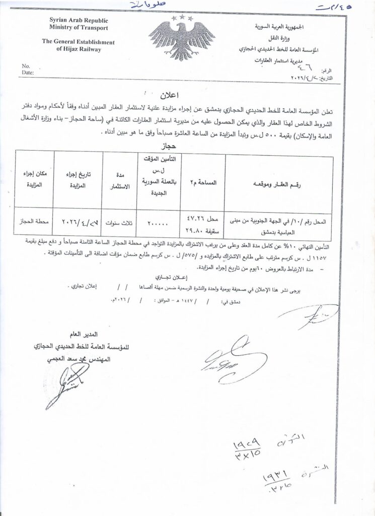 تعلن المؤسسة العامة للخط الحديدي الحجازي بدمشق عن إجراء مزايدة علنية لاستثمار العقار المبين أدناه وفقاً لأحكام ومواد دفتر الشروط الخاص لهذا العقار والذي يمكن الحصول عليه من مديرية استثمار العقارات الكائنة في (ساحة الحجاز- بناء وزارة الأشغال العامة والإسكان ) بقيمة/ 500/ل.س وتبدأ المزايدة من الساعة العاشرة صباحاً وفق ما هو مبين أدناه .